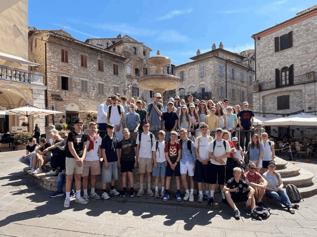 Wie im Jahr 2022 sind wir wieder sechs Tage unterwegs gewesen und haben Norcia, den Geburtsort unseres Schulpatrons Benedikt von Nursia, besuchen können. Neben dem Bewährten der Stadterkundung und des Geistlichen in Gespärchen gab es Neuerungen wie die Begleitung durch eine moderne Franziskanerin auf einem Waldweg in die Eremitage des Franz, ein super Catering in unserer Unterkunft und dass wir dem Sonntag gemäß gleich am ersten Abend unsere Heilige Messe in San Pietro feierten. Perugia wurde wieder ein wunderschöner abendlicher Ausklang mit beeindruckenden Gewinnern der Stadtrallye: Kalle Krull, Mateo Bader und Louis Blume aus der Klasse 8c.