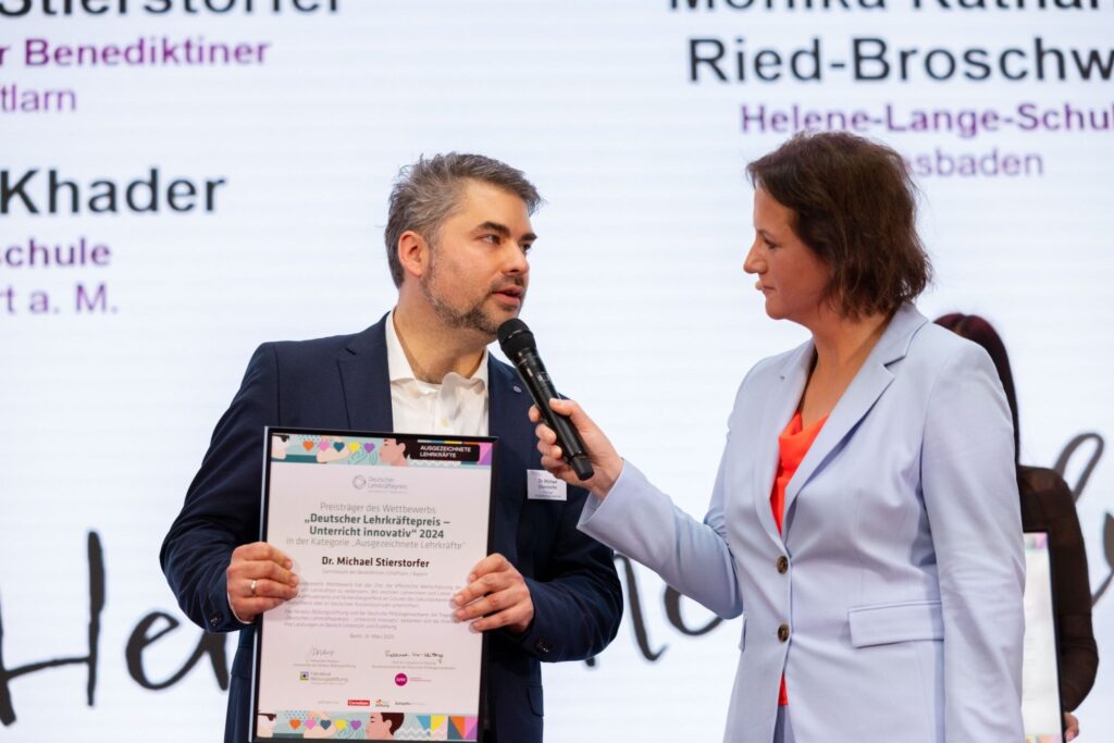 Am 31.03.25 erhielt Dr. Michael Stierstorfer stellvertretend für unsere Schule den Lehrkräftepreis in der Kategorie herausragende Lehrkräfte. Hier schildert er knapp seine Eindrücke: Der Tag der Verleihung war sehr ereignisreich, anstatt eines ruhigen Frühstücks standen ab 8 Uhr Interviews mit unzähligen bayerischen Radiosendern an. Dann ging die Verleihung nach einem sportlichen Sprint zur futuristisch designten Axica-Halle, die zwischen dem altehrwürdigen Hotel Adlon und dem Brandenburger Tor gelegen ist, die Verleihung los. Nach einer coolen Poetry-Slammer-Performance von Kabarettist Lars Ruppel wurden die ersten Urkunden von den namhaften Jurorinnen und Juroren aus der Bildungsszene vergeben: Der Vorstand der Heraeus Bildungsstiftung und der des Deutschen Philologenverbands gratulierten sodann uns Lehrkräften sehr herzlich. Im Gespräch verriet mir die sehr sympathische Gastgeberin Alexandra Heraeus, dass sie in Berg beim Starnberger See wohne. So klein ist die Welt. Eine Einladung in die Klosterschänke wurde sogleich ausgesprochen.