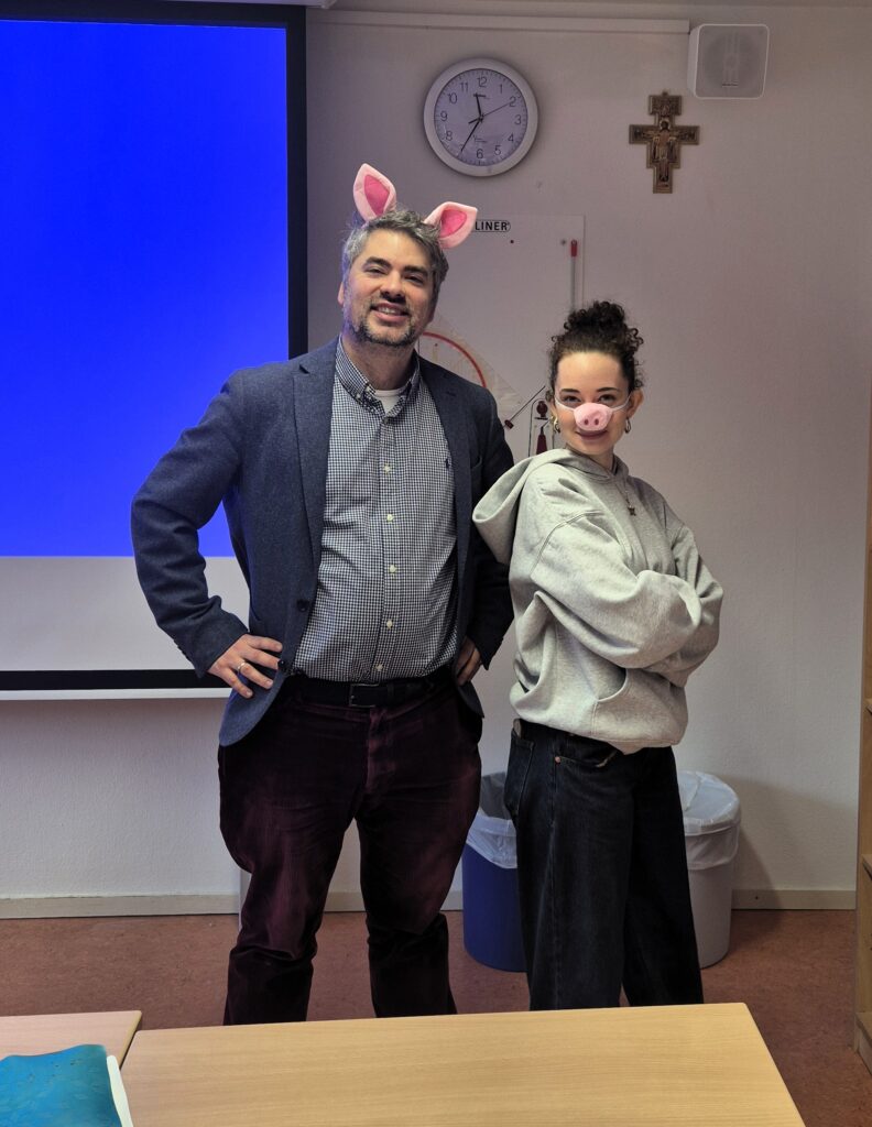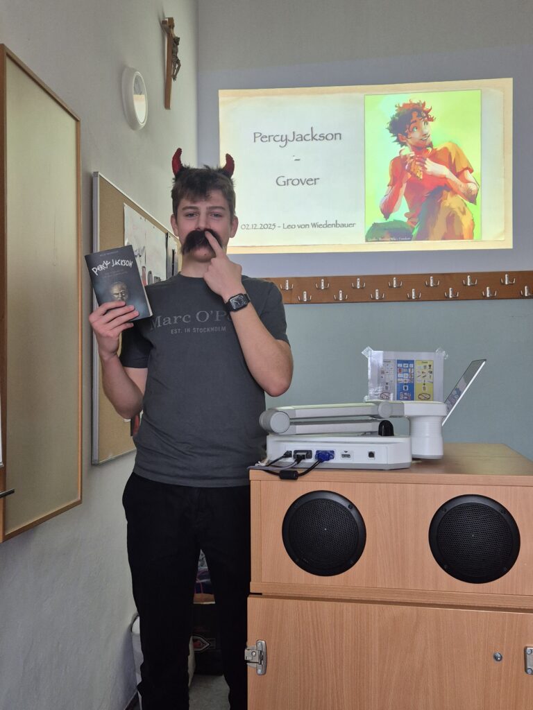 In diesem Jahr waren die Einstiege in Referate zur Präsentation von Zwischen- und Endergebnissen der beiden W-Seminare „Antike Mythologie in aktuellen Kinder- und Jugendmedien“ besonders vielseitig. So verzauberte Kiara de Bardeci in ihrem Referat die Zuhörer in Schweine, da sie über die Zauberin Circe in einem aktuellen Young-Adult-Roman sprach. Heinrich Dahlheimer und Moritz Bruch inszenierten einen actiongeladenen Drachenkampf im Rahmen des Vortrags zum „Hobbit“ (Tolkien). Witzige Ideen, um ihr Publikum zu beeindrucken hatten auch Leo von Wiedenbauer, der sich im Kontext seines Themas zu „Percy Jackson“ (Riordan) als Satyr Grover verkleidete, und Sara Hübner, die im Rahmen ihres Themas zu religiösen Ritualen in den „Helden des Olymps“ (Riordan) sprach, baute einen Altar mit Stofftieren auf. Durch ihre vielseitigen Ideen bewiesen die Seminaristen wie aktuell und ansprechend Einstiege in antike Welten sein können.
