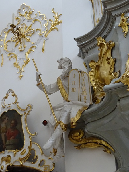 Seitlich am Korb befinden sich die Figuren des Moses mit Gesetzestafeln und Stab und des Apostels Paulus mit Buch und Flammenschwert.