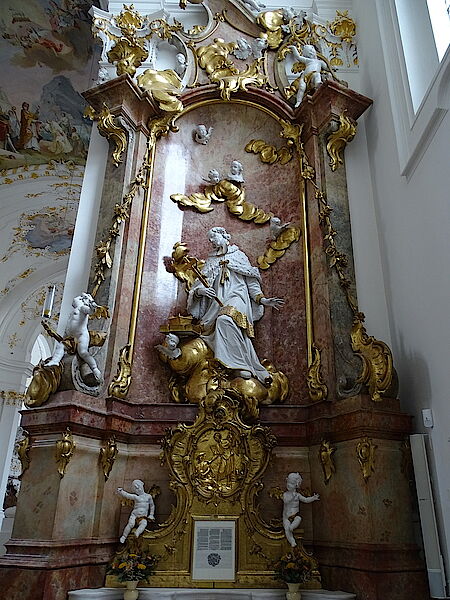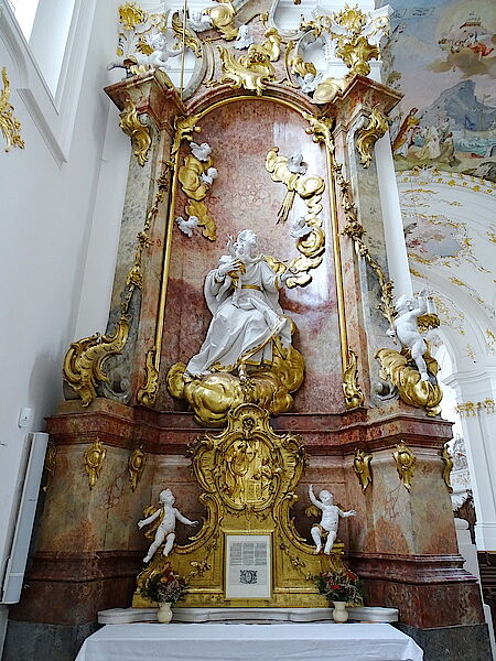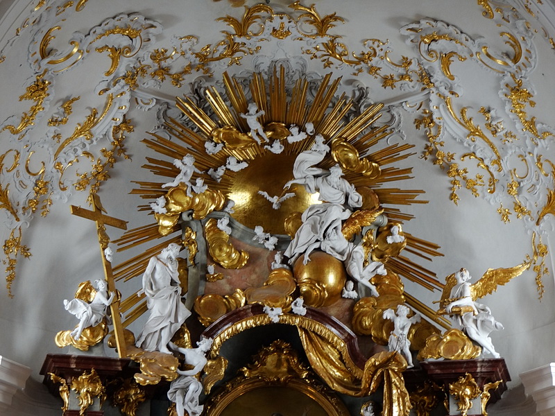 Der Himmel hört also nicht mit dem gemalten Altarbild auf, sondern geht in die dreidimensionale Plastik über und wird abgeschlossen durch Martin Heigls Fresko mit huldigenden Putten und Rosengirlanden. Ein Engel auf der rechten Seite des elegant geschwungenen Gebälks hält Krone und Zepter für die Gottesmutter bereit; der auferstandene Christus links steht in Blickkontakt mit der auffahrenden Maria.