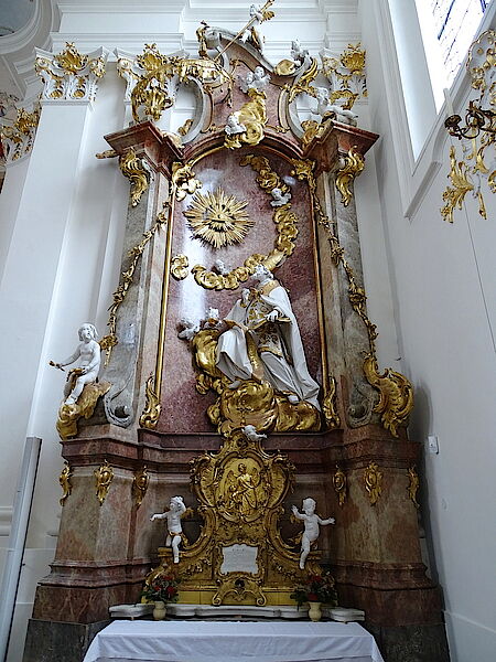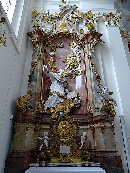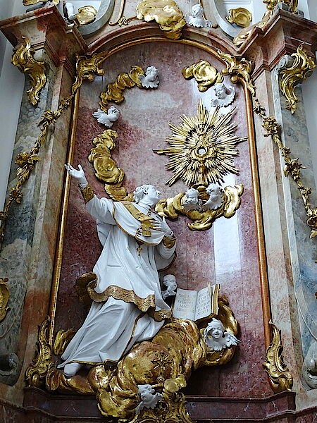 Die beiden vordere Seitenaltäre sind dem Prämonstratenserorden verpflichtet: links der Stifter des Ordens der hl. Norbert von Xanten, rechts der hl. Augustinus, dessen Regel Grundlage der Prämonstratenser ist.