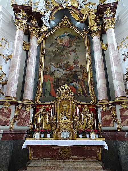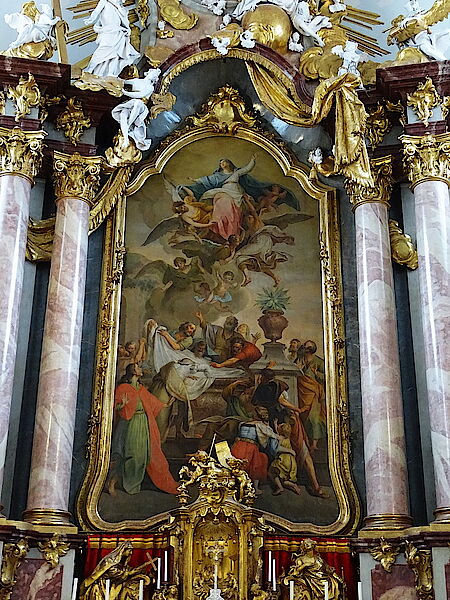 Die Altäre der Klosterkirche entstanden in der Werkstätte Johann Baptist Straubs (1755-1764). Das von Balthasar Augustin Albrecht 1755 gemalte Hochaltargemälde zeigt Mariä Himmelfahrt. Staunend umstehen die Apostel den offenen Sarkophag‚ einige blicken in den Himmel, in den Maria aufsteigt. Aus der plastischen Giebelgruppe mit der Heiligsten Dreifaltigkeit kommt ihr Christus entgegen.