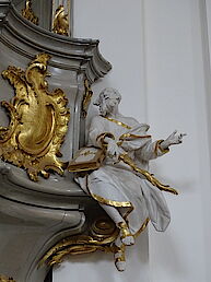 Der Kirchenvater Augustinus hält die Schreibfeder in der Hand und blickt sinnend auf das Auge Gottes im gleichseitigen Dreieck: Symbol der Dreifaltigkeit.