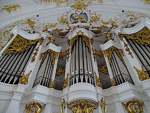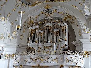 Auf der Westempore befindet sich die Orgel, die wie ein geöffneter Flügelaltar wirkt. Während der Prospekt noch vor der um 1762 gebauten Orgel Anton Bayrs aus München stammt, verfügt die Klosterkirche seit 1996 über eine imposante Orgel (31 Register), gebaut von Hans—Georg Vleugels in Hardheim. Engel musizieren auf dem geschwungenen Gesims. Sie erinnern an feierliche Klänge, die in der Barockzeit hier „Gottes Majestät und Milde“ vorherrlichten. Bei der Klosteraufhebung 1803 lagen über 1000 Kompositionen vor mit über 150 verschiedenen Urhebern. Unter ihnen ist der letzte Schäftlarner Prämonstratenser-Kapellmeister Evermod Groll (1755-1810) besonders hervorzuheben.