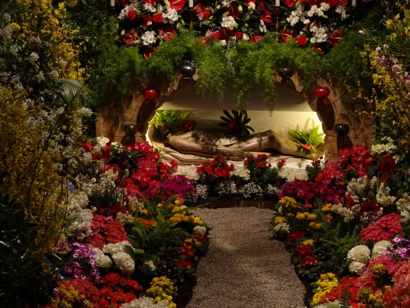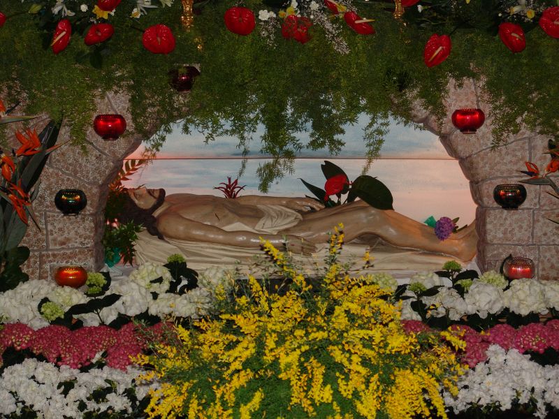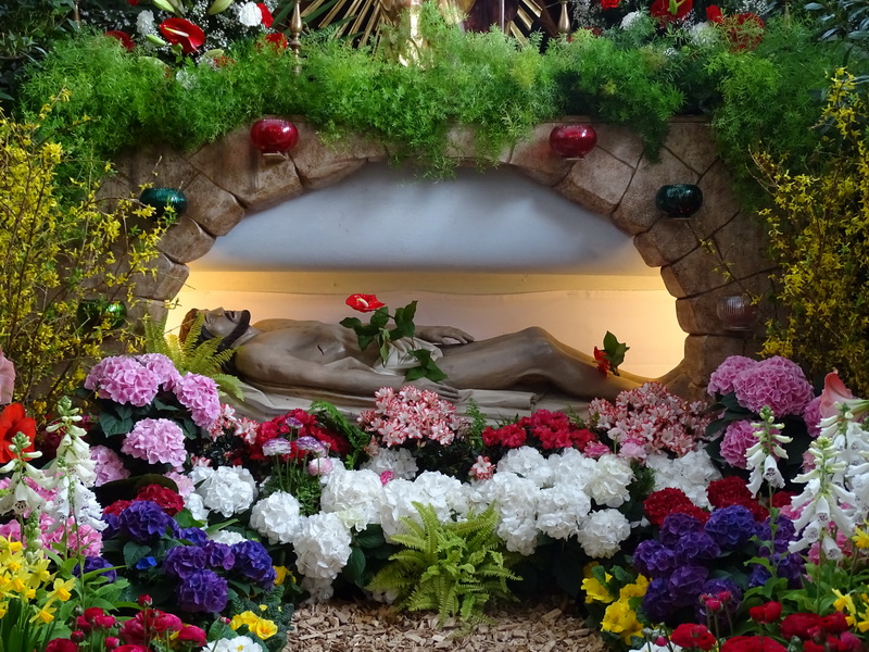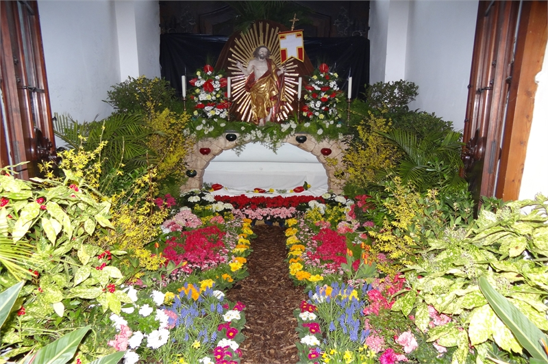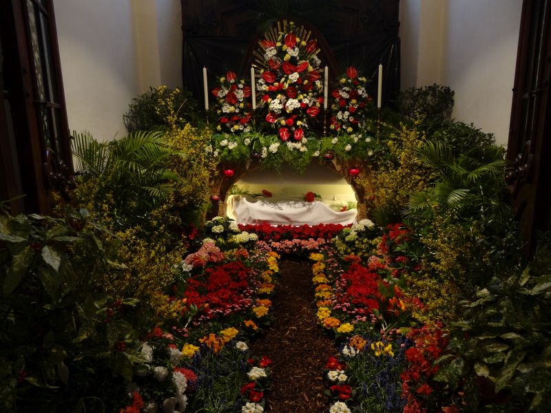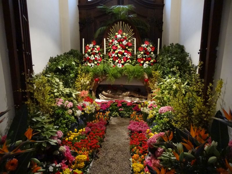 Das Heilige Grab im Laufe der Jahre und an den verschiedenen Standorten. Zuerst am Kreuzaltar, schließlich im Turmhaus (Haupteingang), wo es auch heute noch zu finden ist.