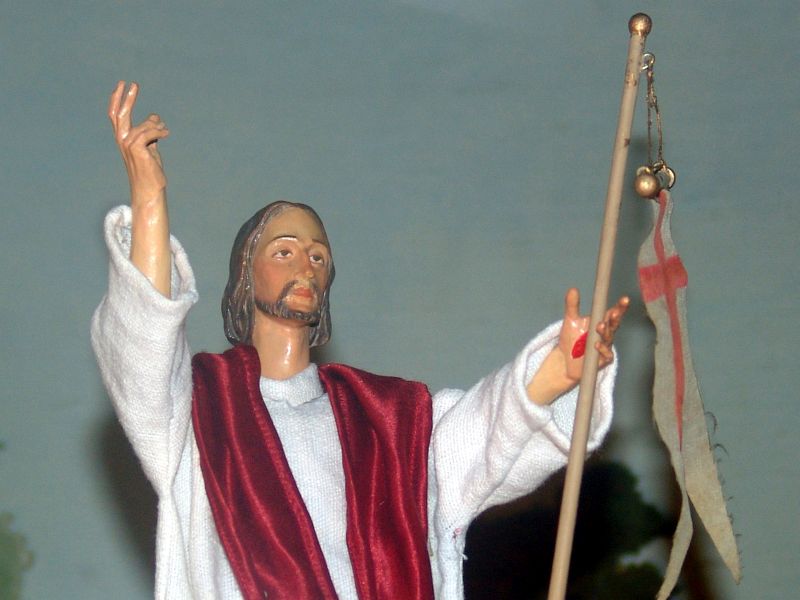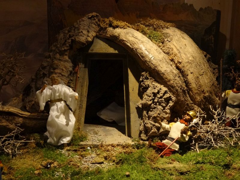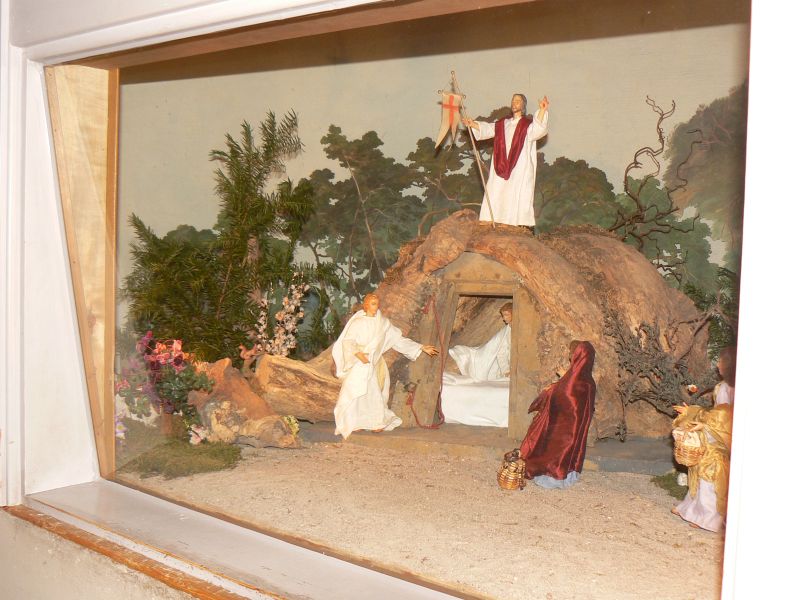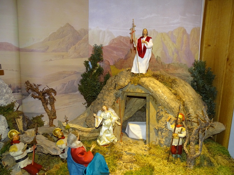 Krippendarstellungen mit Ostermotiven: der Auferstandene, das leere Grab, die Engel, Maria Magdalena im Garten.